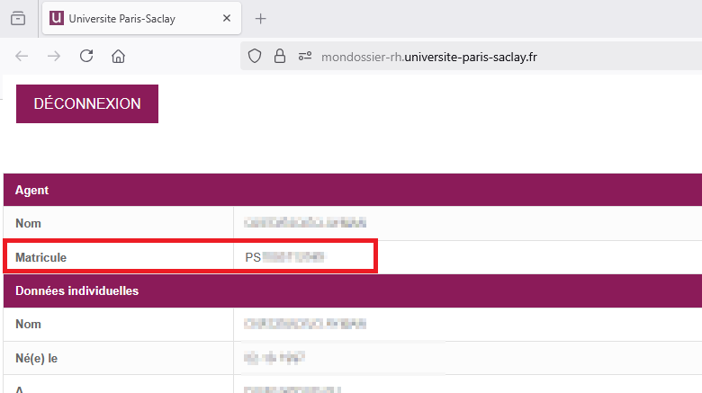 Pour le personnel de UPSaclay, vous pouvez récupérer votre matricule agent via la procédure suivante :